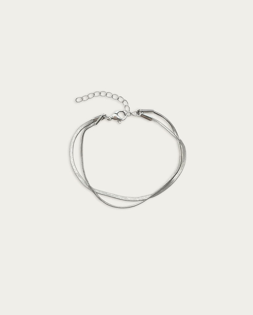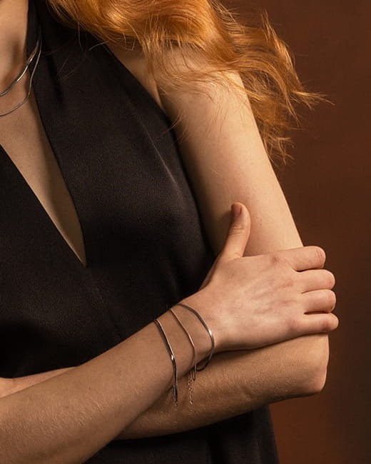 Bransoletka wykonana ze srebra próby 925, cenionego w jubilerstwie za trwałość, szlachetność i połysk. Jej konstrukcję tworzą dwa łańcuszki typu snake (żmijka), połączone wspólnym zapięciem, które układają się równolegle i stanowią wielowarstwową kompozycje.