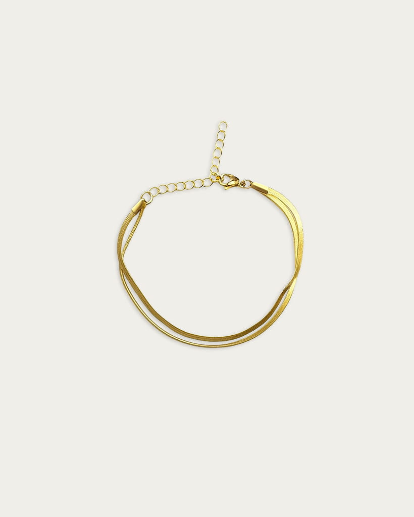 Bransoletka wykonana ze srebra próby 925, cenionego w jubilerstwie za trwałość, szlachetność i połysk. Pozłacana metodą PVD. Jej konstrukcję tworzą dwa łańcuszki typu snake (żmijka), połączone wspólnym zapięciem, które układają się równolegle i stanowią wielowarstwową kompozycje.