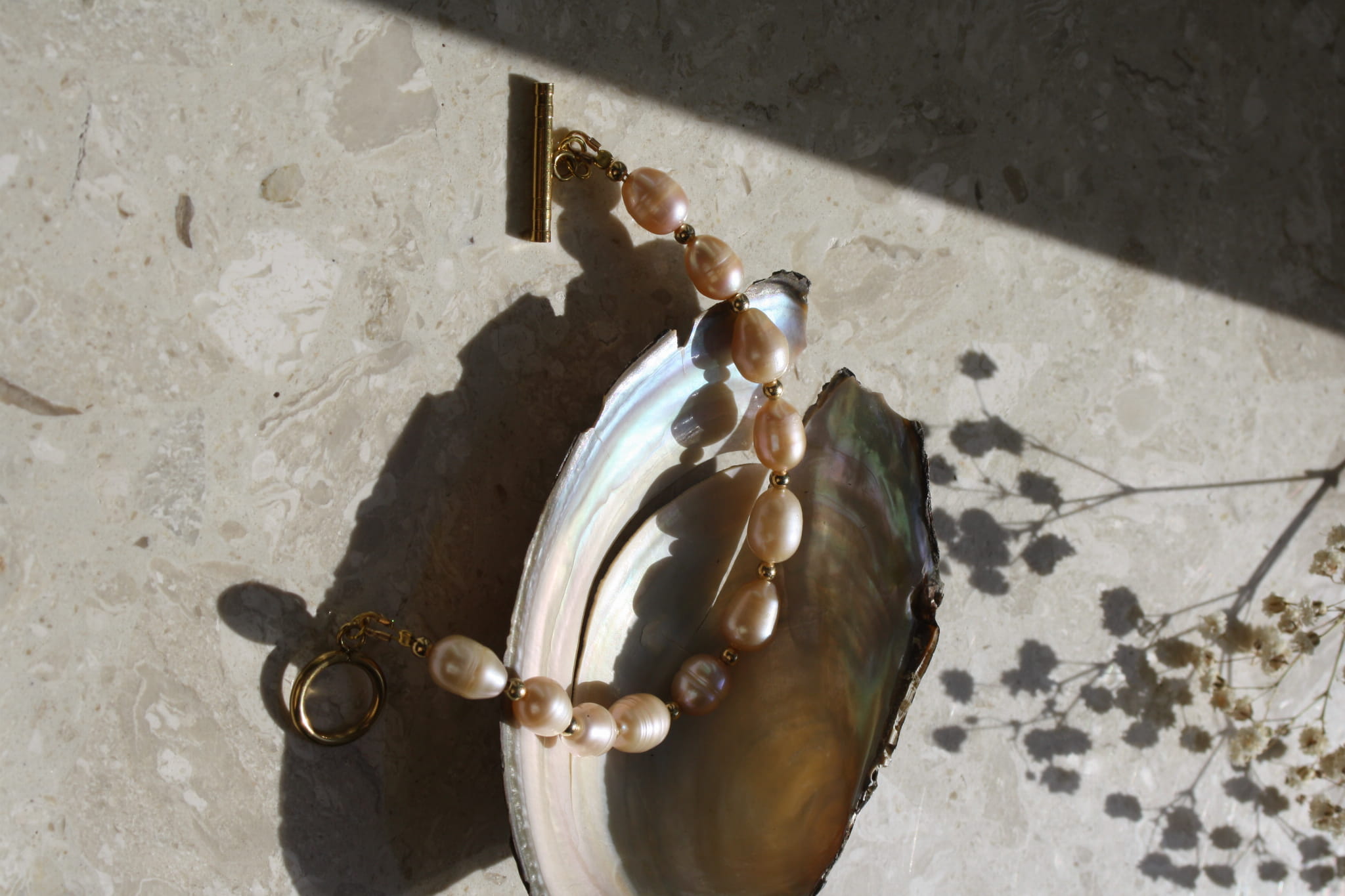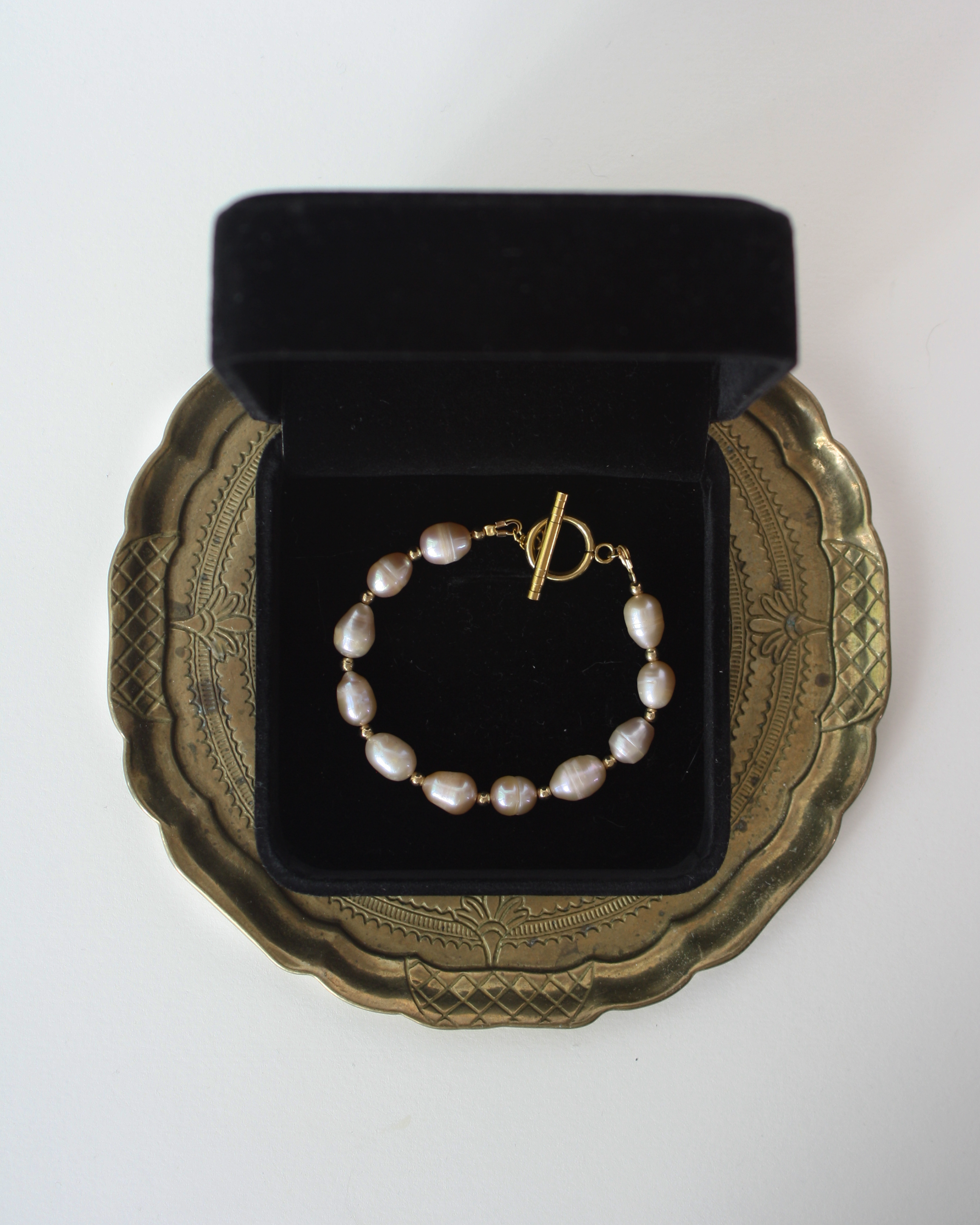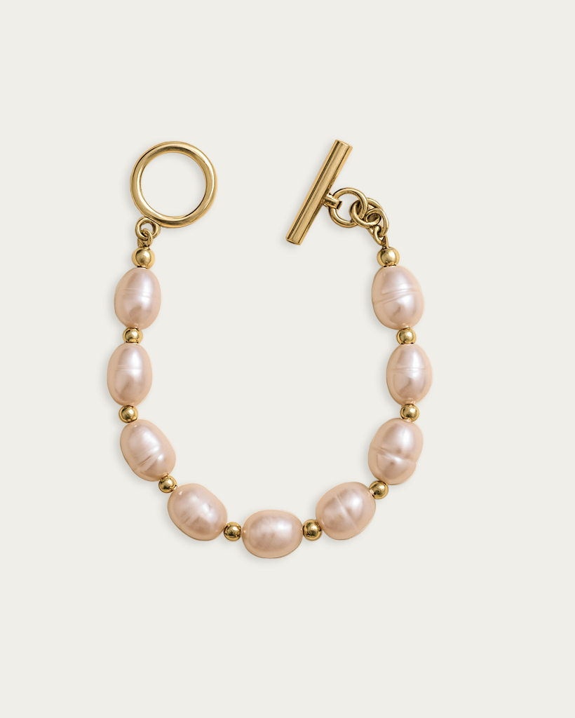 Bransoletę zamyka solidne zapięcie typu toggle, również wykonane ze stali szlachetnej z wykończeniem w kolorze złota. Składa się ono z kółka oraz poprzecznej belki o geometrycznej formie, które razem tworzą praktyczny i jednocześnie dekoracyjny element kompozycji. Dzięki równomiernemu rozmieszczeniu pereł i metalowych przekładek całość zachowuje doskonałą proporcję.