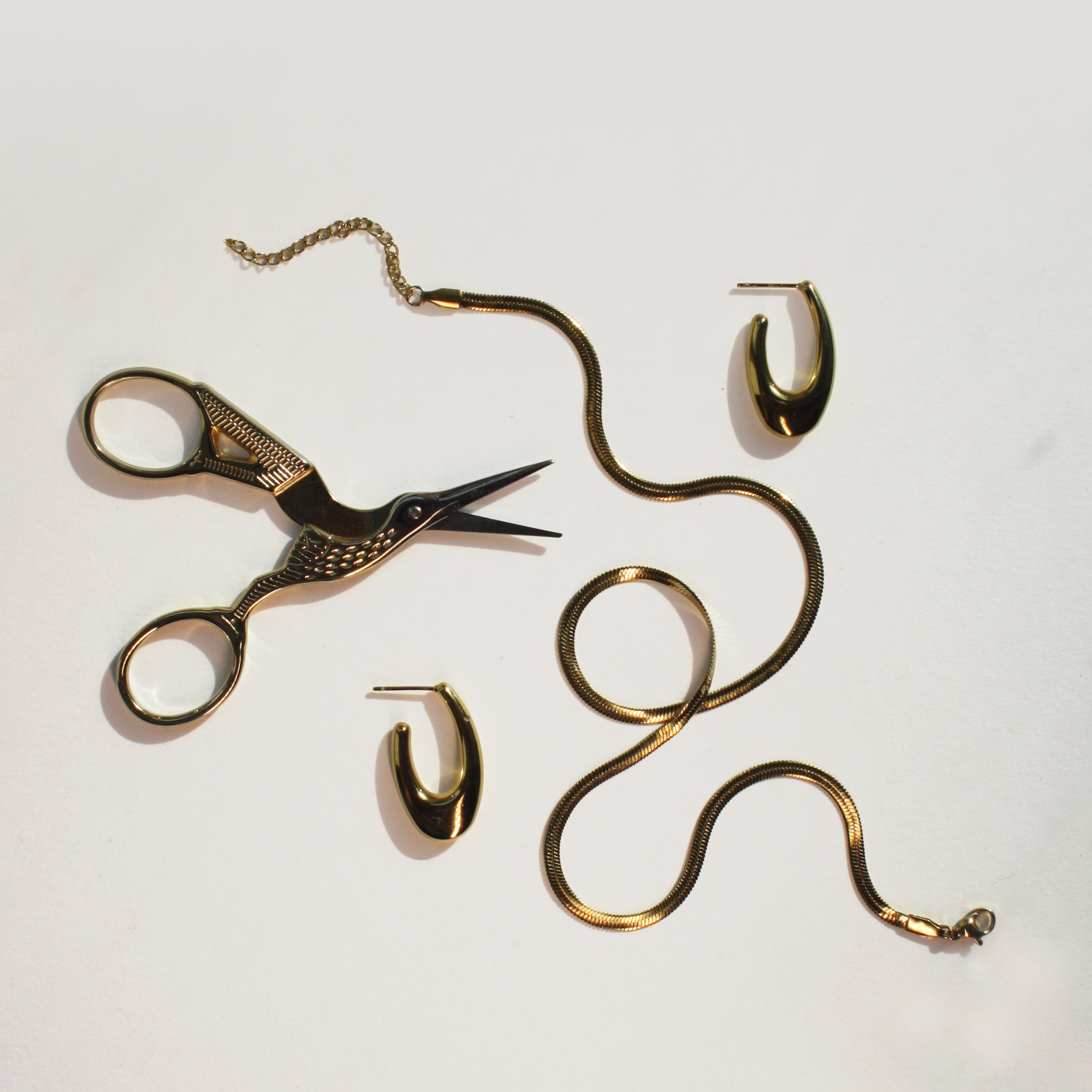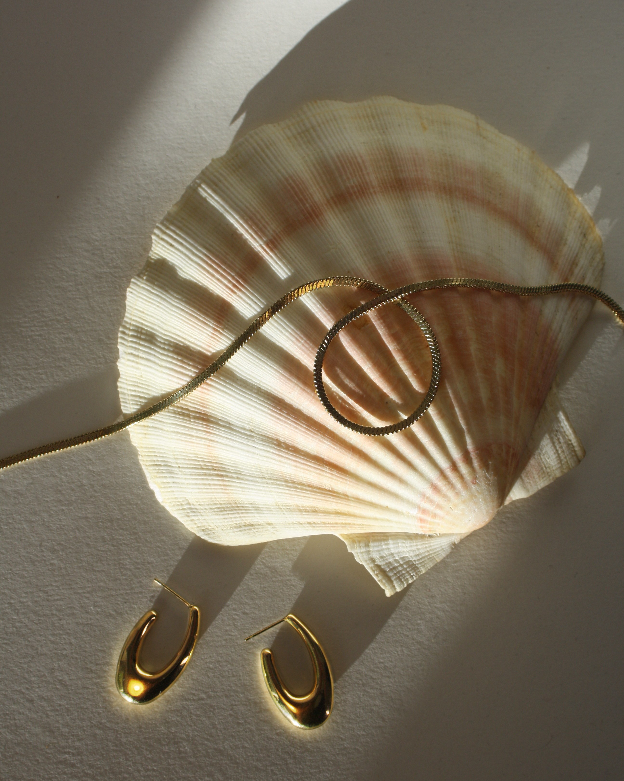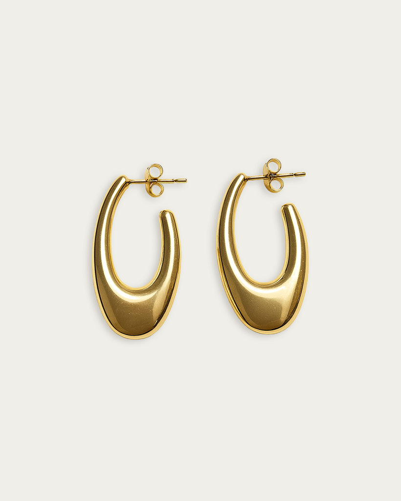 Kolczyki sztyfty o charakterystycznej, rzeźbiarskiej linii w kształcie otwartego owalu. Wykonane zostały ze stali szlachetnej, pokrytej trwałą powłoką złocenia PVD, która zapewnia podwyższoną odporność na ścieranie i długotrwałe utrzymanie intensywnego blasku.