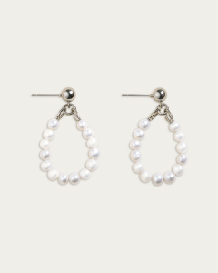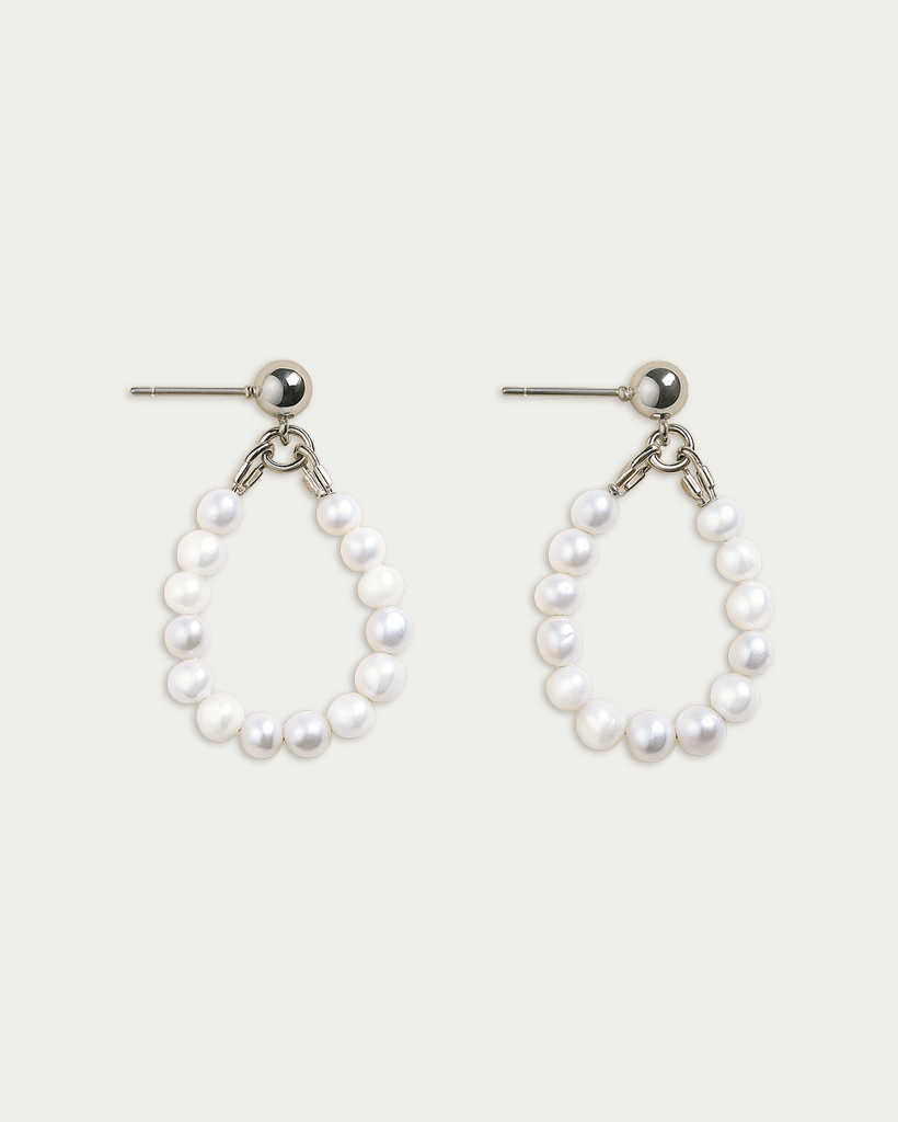 Kolczyki wykonane z naturalnych pereł słodkowodnych typu „milky” o średnicy 2–3 mm, ręcznie zestawionych w formę delikatnych, owalnych zawieszeń. Każda perła charakteryzuje się subtelną mleczną barwą i gładką powierzchnią, co nadaje całości wyrafinowany i elegancki charakter.