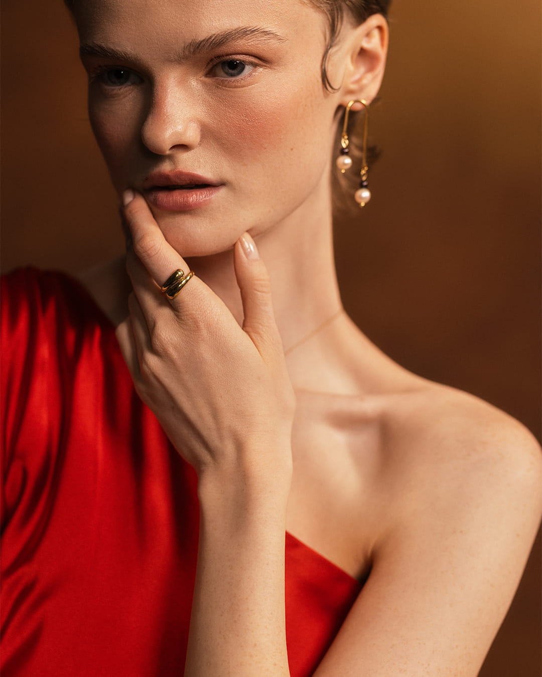 Konstrukcja kolczyków oparta jest na geometrycznym pałąku, który wysmukla linię szyi. Precyzyjne ogniwa zapewniają swobodny ruch elementów, a zapięcie typu sztyft z barankiem gwarantuje wygodę i bezpieczeństwo noszenia.