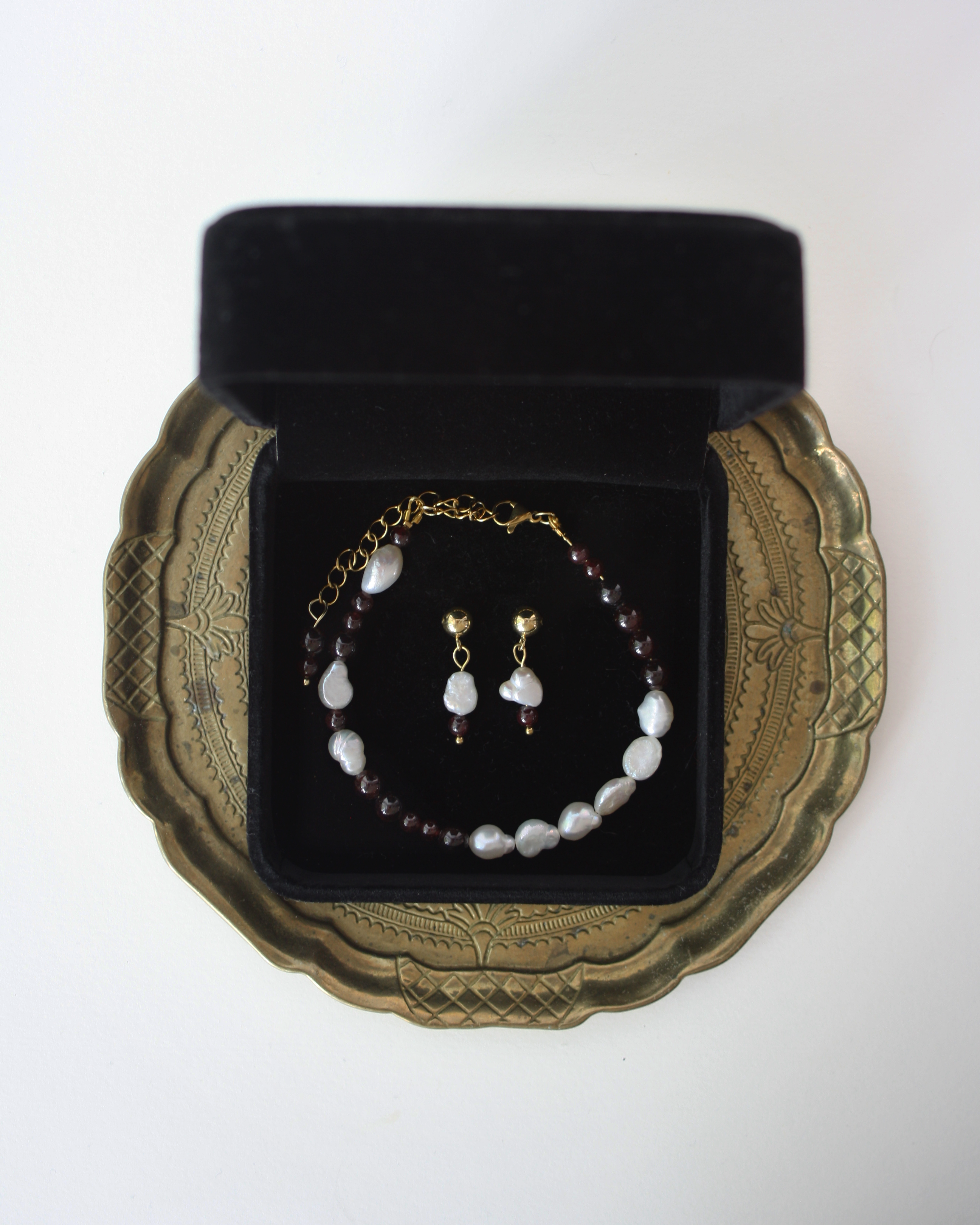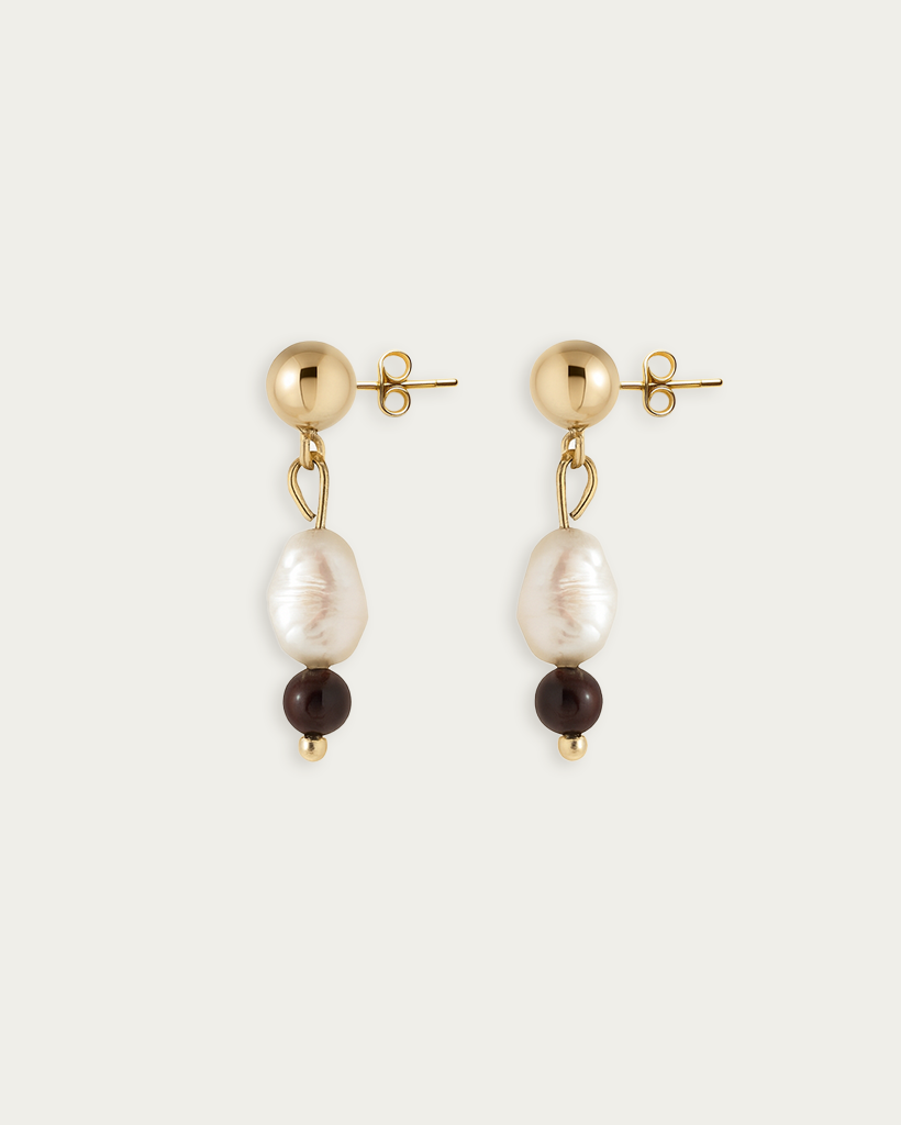 Pod perłą zawieszono szlifowaną na gładko kulę granatu o głębokiej, winno-bordowej barwie, która kontrastuje z jasnym blaskiem masy perłowej.