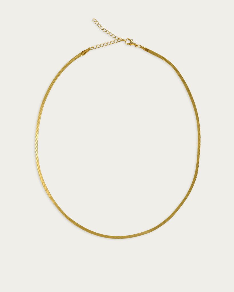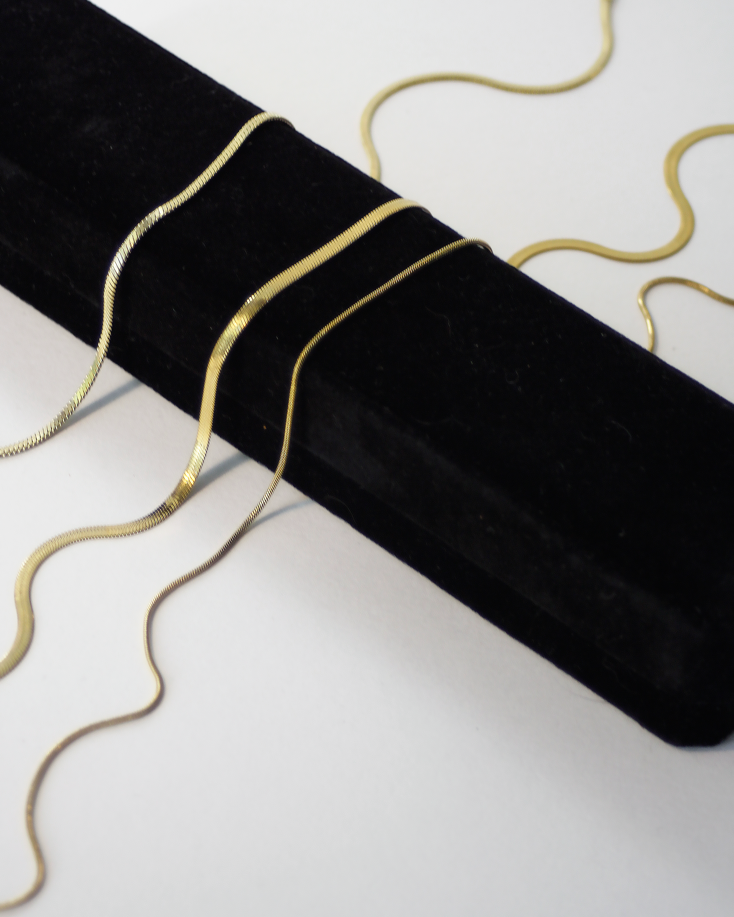 Elegancki łańcuszek wykonany ze stali szlachetnej pokrytej złotem metodą PVD, która zapewnia wyjątkową odporność na ścieranie oraz długotrwały połysk w szlachetnym, złotym odcieniu. Powierzchnia łańcuszka cechuje się gładką, jedwabistą fakturą, uzyskaną dzięki precyzyjnej technice splotu żmijkowego (snake chain), który układa się miękko i idealnie przylega do skóry.