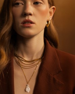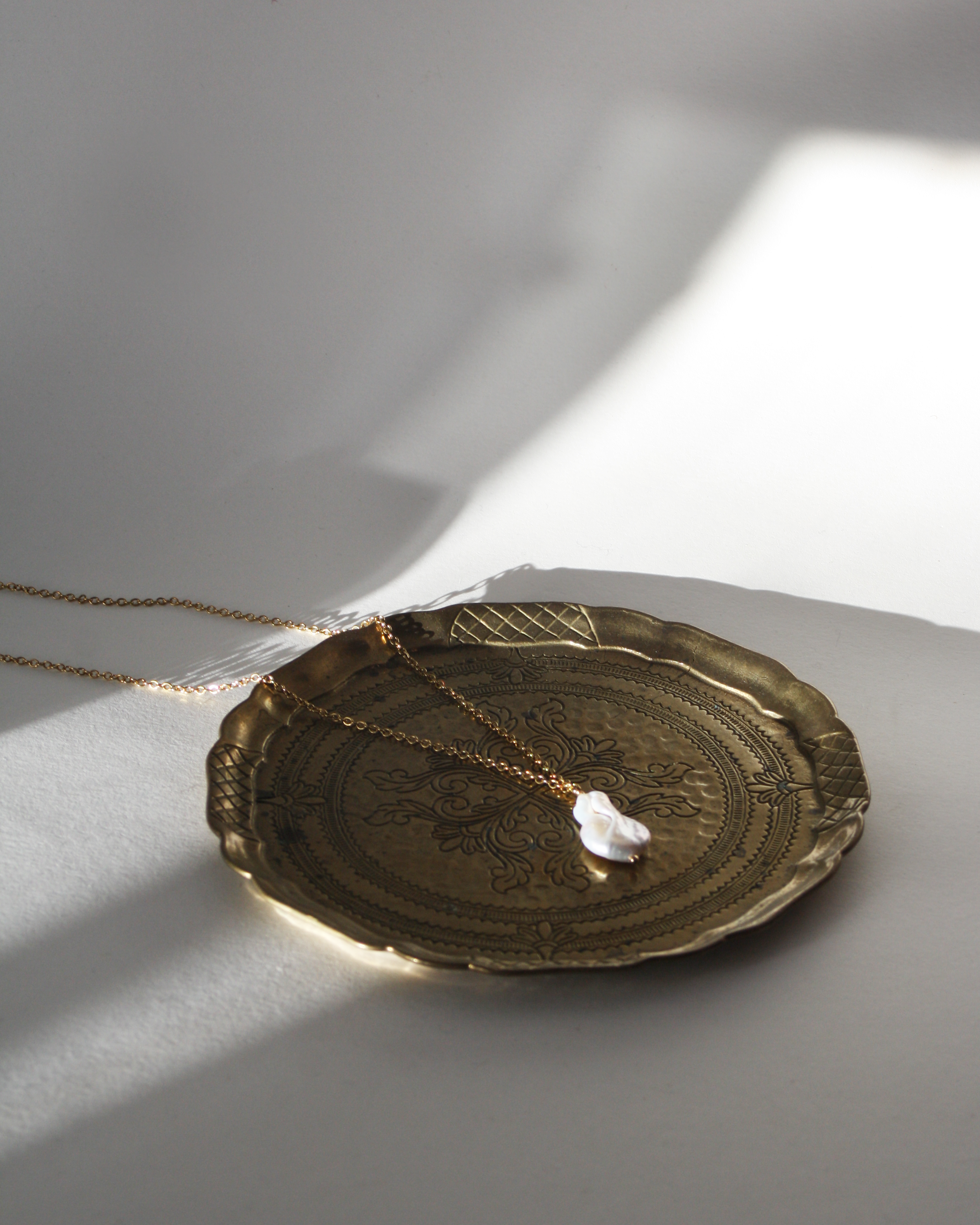 Perła Zawieszona jest na eleganckim, złoconym łańcuszku o subtelnym, skręcanym splocie. Minimalistyczna forma oprawy podkreśla naturalne piękno kamienia, czyniąc naszyjnik idealnym zarówno na co dzień, jak i na wieczór.