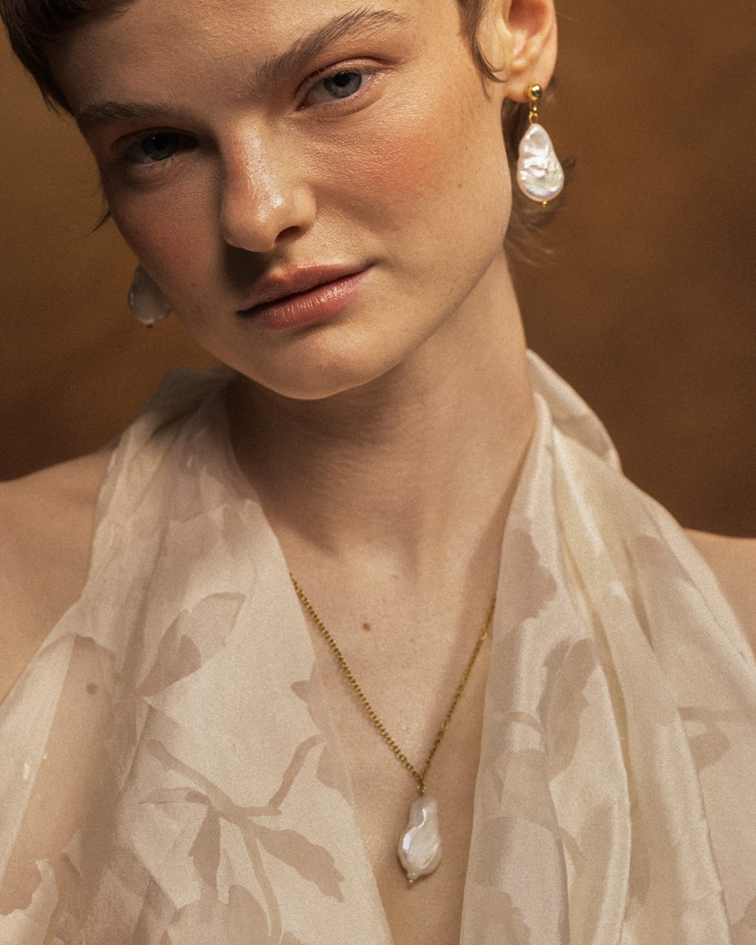 Wyjatkowy naszyjnik, którego centralnym punktem jest naturalna perła barokowa o długości 1,6–1,7 cm. Perła zachwyca szlachetnym połyskiem i organiczną formą – każda sztuka jest unikatowa, różniąca się kształtem i fakturą, co nadaje biżuterii niepowtarzalny charakter.