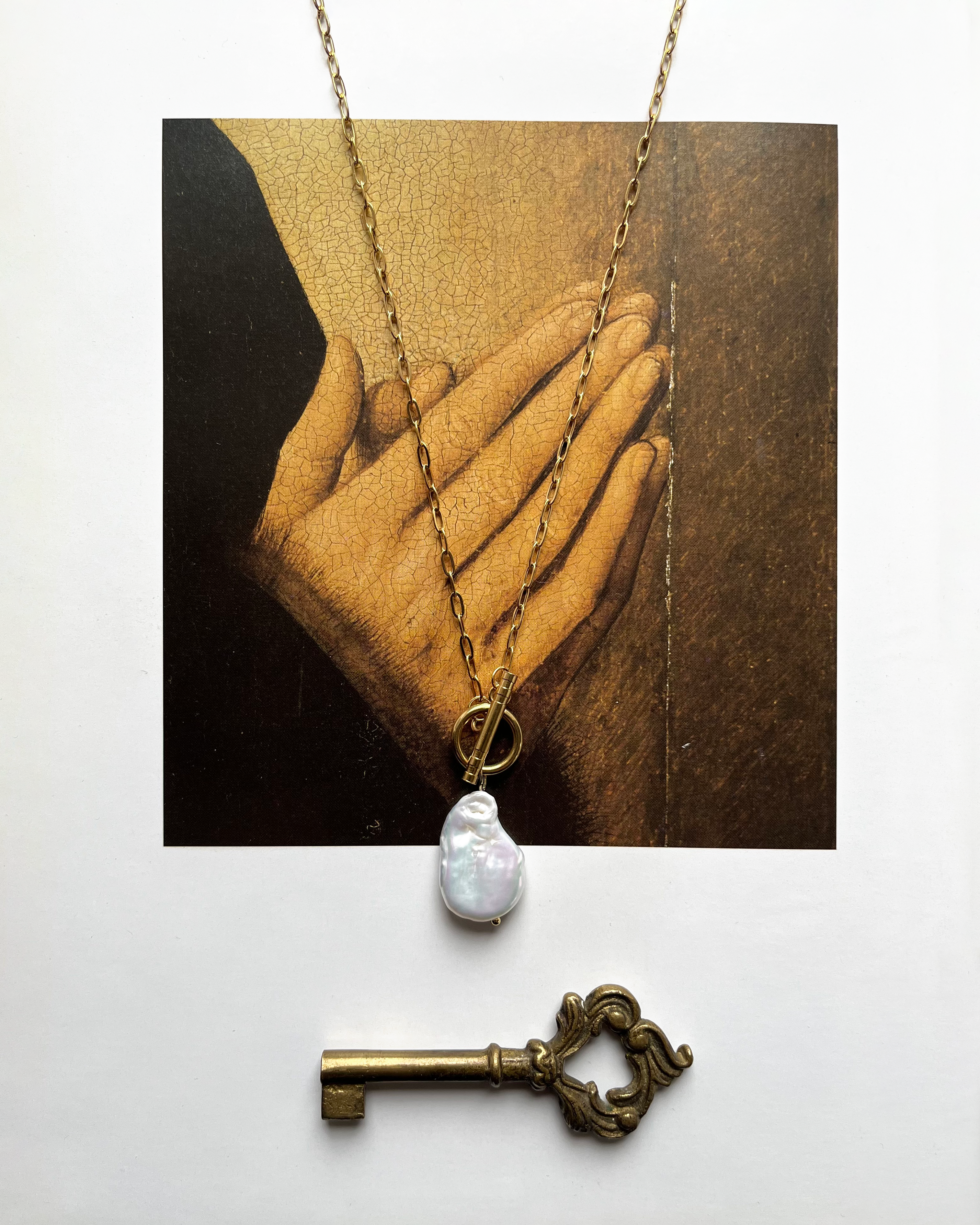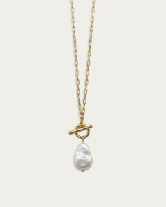 Perła została zawieszona na eleganckim łańcuszku o wydłużonych ogniwach, zakończonym ozdobnym zapięciem typu toggle, które pełni funkcję zarówno praktyczną, jak i dekoracyjną. Precyzyjne wykonanie i starannie wyselekcjonowana perła sprawiają, że naszyjnik jest idealnym wyborem dla kobiet ceniącychi klasyczną elegancję w nowoczesnej odsłonie.