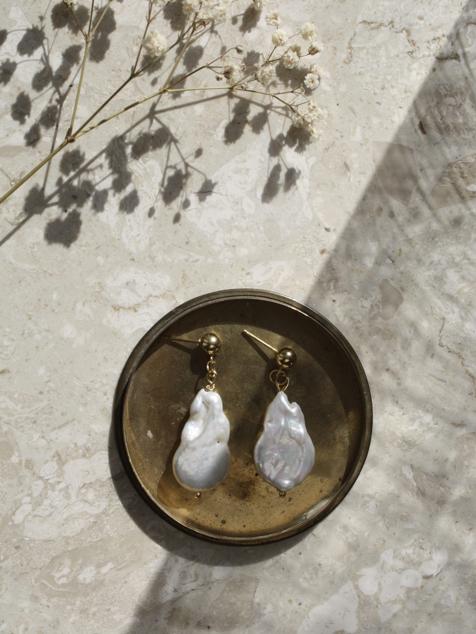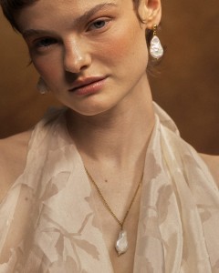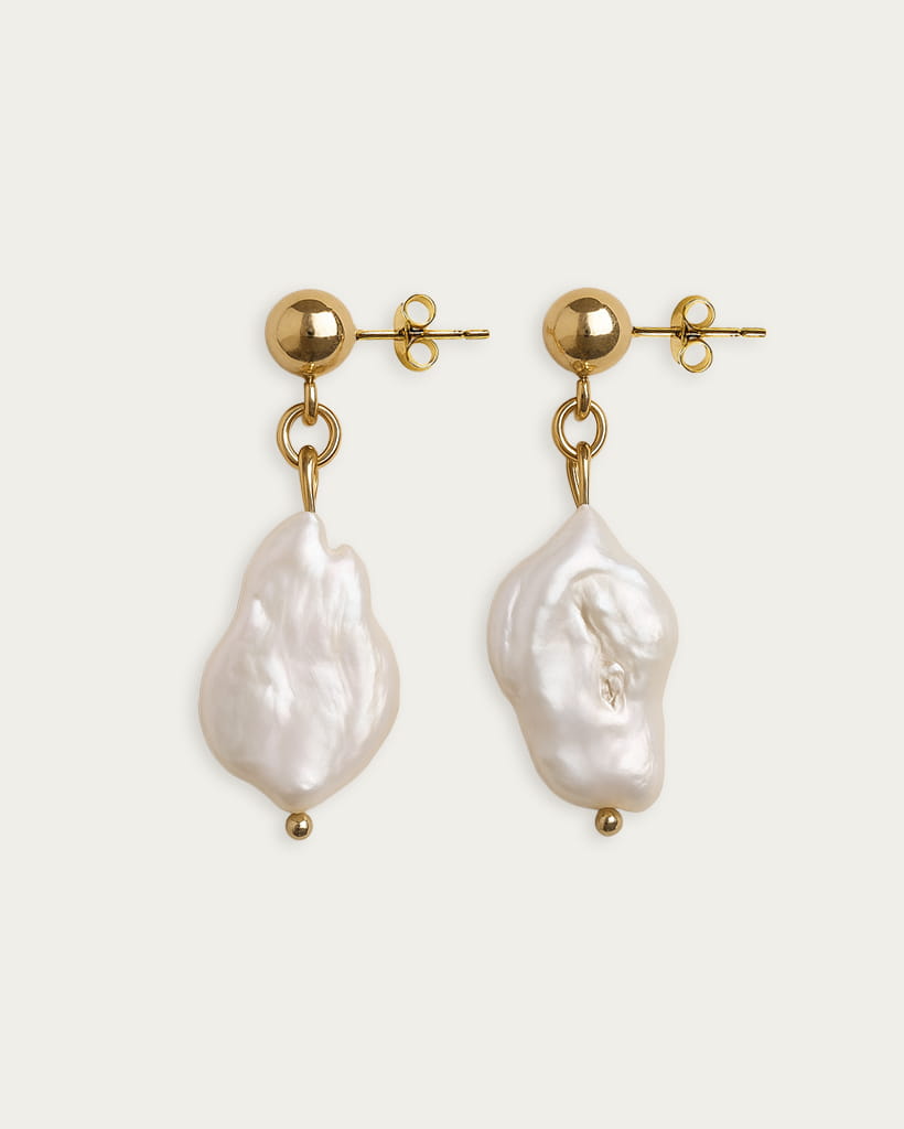 Wyjatkowy zestaw, którego centralnym punktem jest naturalna perła barokowa o długości 1,6–1,7 cm. Perła zachwyca szlachetnym połyskiem i organiczną formą – każda sztuka jest unikatowa, różniąca się kształtem i fakturą, co nadaje biżuterii niepowtarzalny charakter. Każda perła zawieszona jest na eleganckim, złoconym łańcuszku o subtelnym, skręcanym splocie. Kolczyki zawieszone są na sztyfcie ze złoconej 18-karatowym złotem stali szlachetnej.