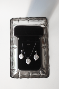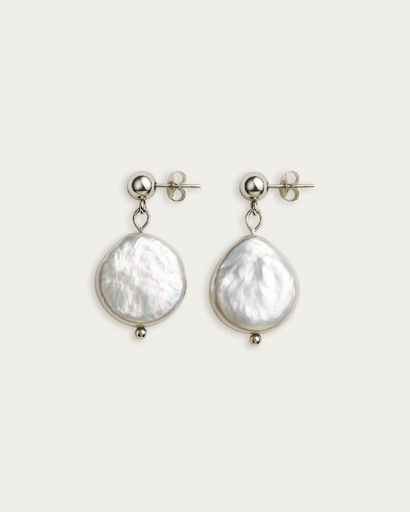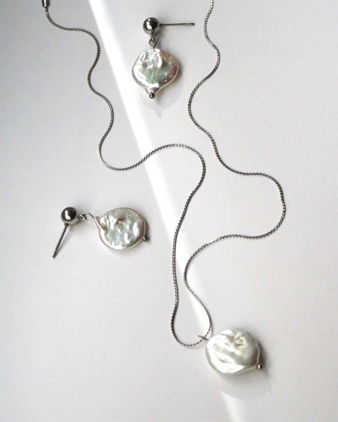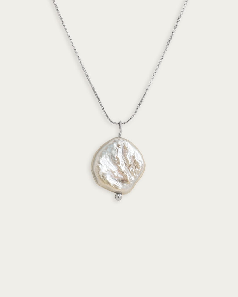 Centralnym elementem kompozycji jest naturalna perła słodkowodna typu coin (monetowa) o średnicy ok. 16-17 mm. Perła ta charakteryzuje się nieregularnym, organicznym kształtem, podkreślającym jej autentyczne pochodzenie. Jej powierzchnia wykazuje wyjątkowo silną irydescencję (orient) – w świetle mieni się wachlarzem refleksów, od srebrzystobiałych po różowo-zielone i opalizujące odcienie. Ta gra światła sprawia, że każda perła jest jedyna w swoim rodzaju, a subtelne nieregularności nadają jej indywidualny charakter.